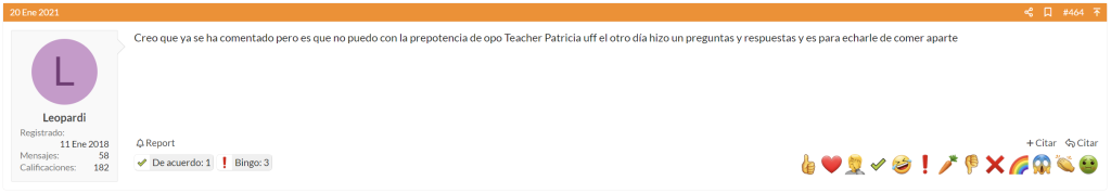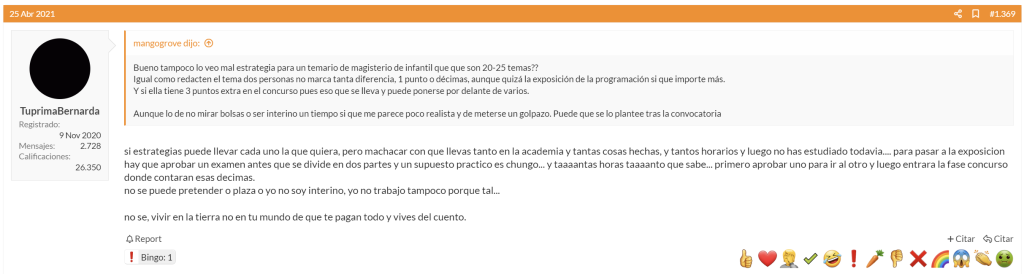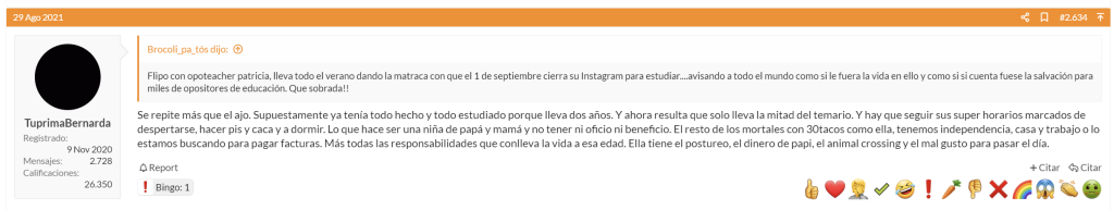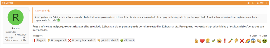 Durante el último año de preparación decidí alejarme de las redes sociales y pausé todas mis cuentas y suscripciones. Antes de eso hice captura de todos los mensajes que se habían hecho sobre mí y los tenía siempre a la vista para motivarme. Obviamente no saqué la plaza para darle a nadie en los morros, pero me dio mucho mucho gustito haber seguido a lo mío, sin que eso me afectase o me apagase y a los pocos días de sacar la plaza publiqué en mi Instagram todos esos comentarios. En especial recuerdo los de «TuPrimaBernarda» que por su puesto, no sacó plaza. Gracias prima 🤭