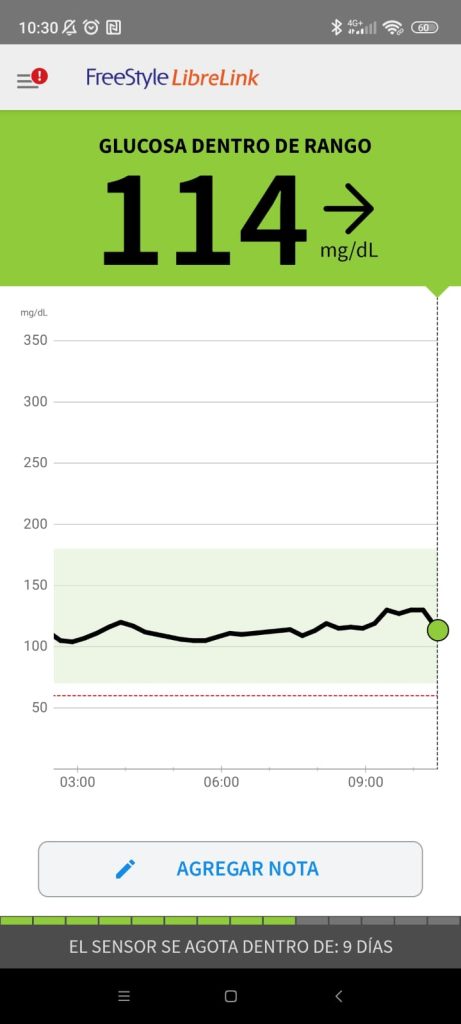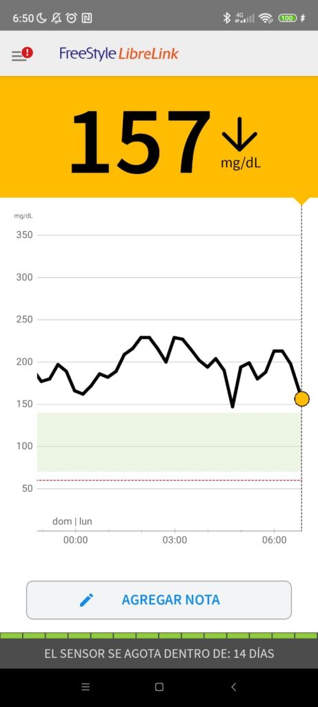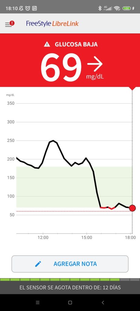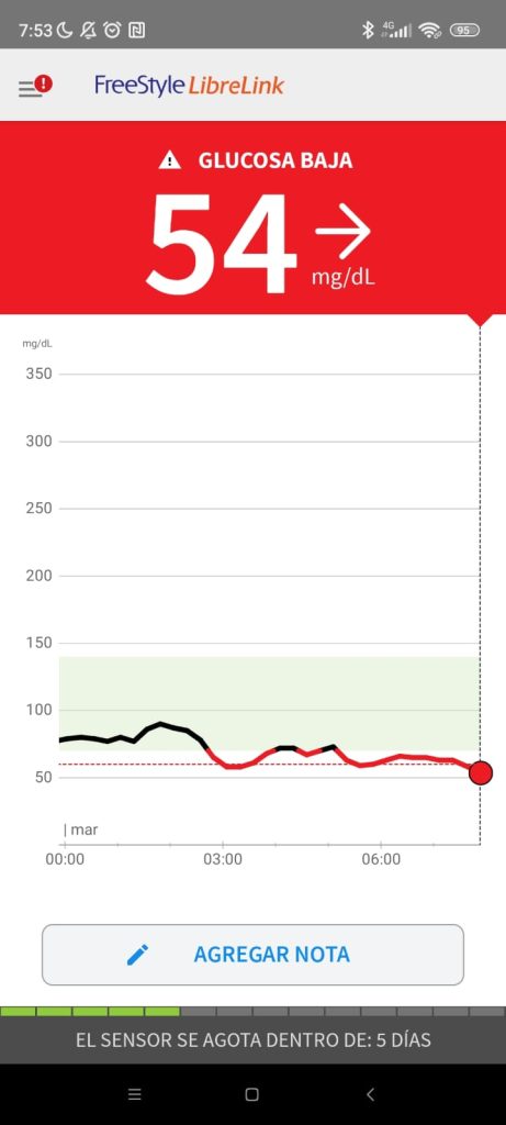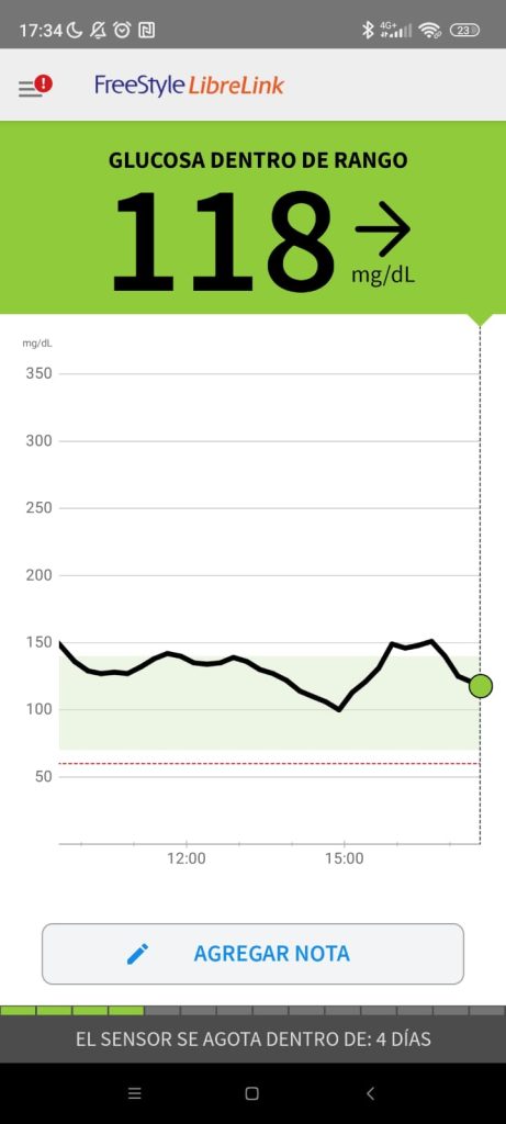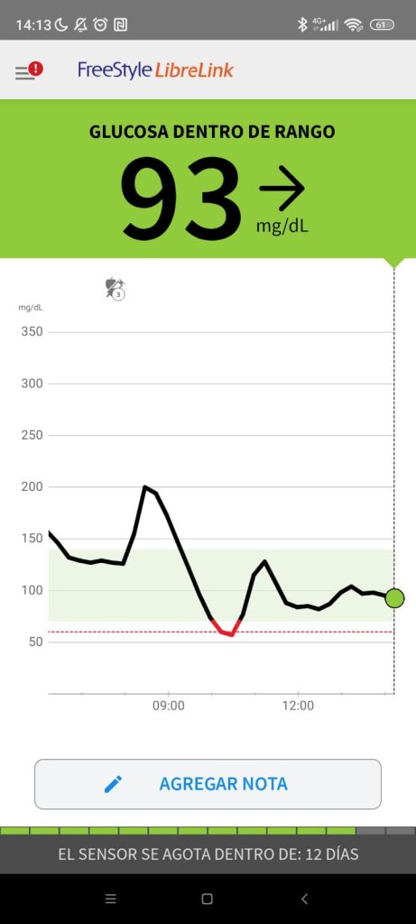Cada día es totalmente distinto. Dejo algunos ejemplos de los niveles de glucosa que marca el sensor que llevo en el brazo:
